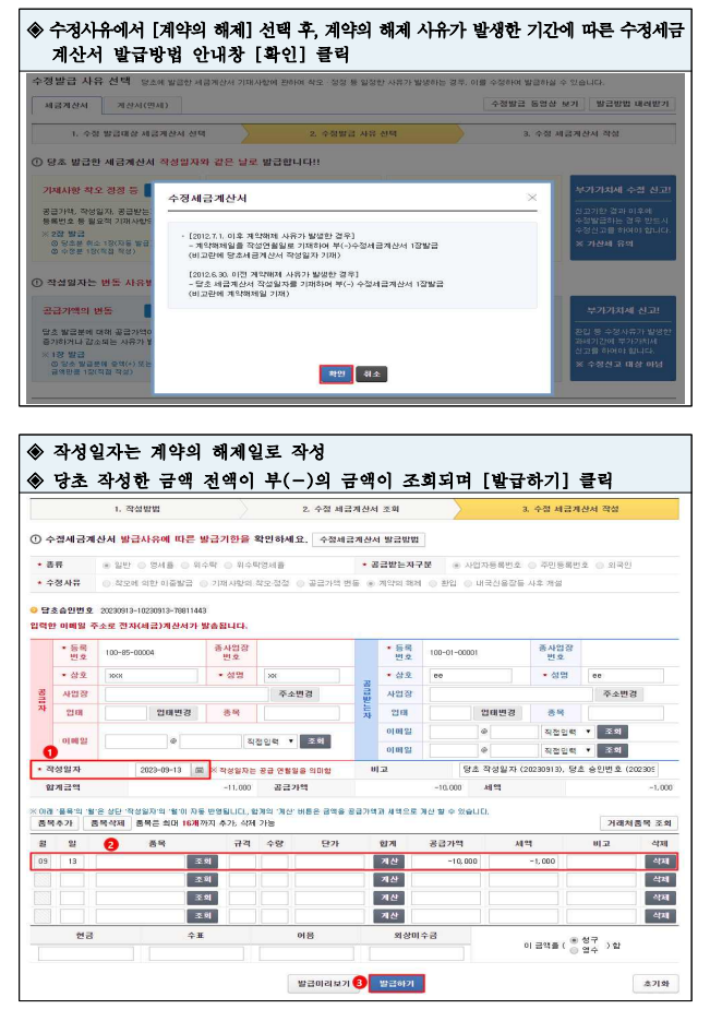 (계약의 해제)로 수정세금계산서를 발급하면 전액이 부 (-)의 세금계산서 1장이 발급됩니다.