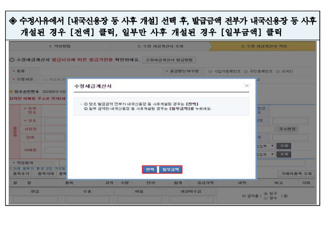 ◈ 수정사유에 (내국신용장 등 사후 개설) 선택 후, 발급금액 전부가 내국신용장 등 사후 개설된 경우 (전액) 클릭, 일부만 사후 개설된 경우 (일부금액) 클릭합니다.
